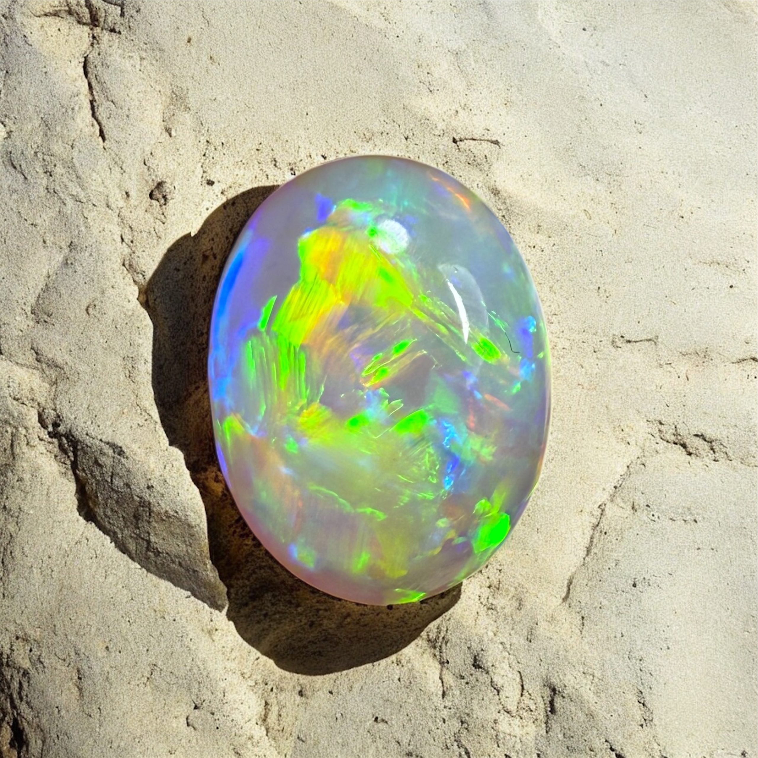 “Lunavelle is a high-dome crystal opal that mesmerizes from every angle, a kaleidoscope of color and pattern on both sides. Its vibrant, shifting hues invite endless imagination, offering limitless possibilities for a truly breathtaking jewelry creation. Ethereal and sophisticated, Lunavelle carries a hint of moonlit magic, capturing the eye and the heart with its luminous, otherworldly beauty.”